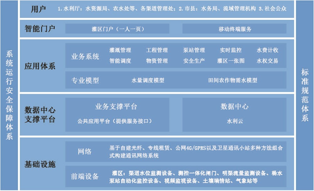 现代化灌区信息化体系基于已建的数据中心、业务平台等智慧水利核心框架,开展现代化灌区信息化建设,覆盖数据采集、传输、存储、应用决策、灌区水利信息服务等各个环节。系统充分利用现代信息技术,深入开发和广泛利用灌区信息资源,大大提高信息采集和加工的准确性以及传输的时效性,做出及时、准确的反馈和预测,为灌区管理部门提供科学的决策依据,全面提升灌区经营管理的效率和效能。