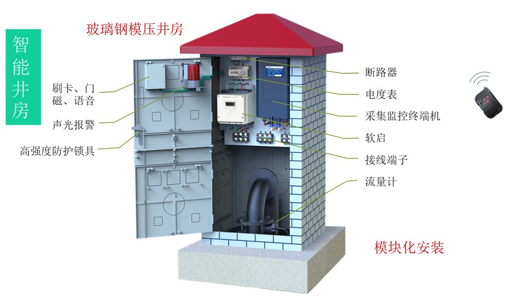 机井(地下水)取水计量监控设施,集刷卡取水、自动用水用电计量、水泵控制、远程监测等功能于一体,实现地下水取水自动计量、IC卡控制、远程传输的一体化和一卡式操作、一柜式安装。