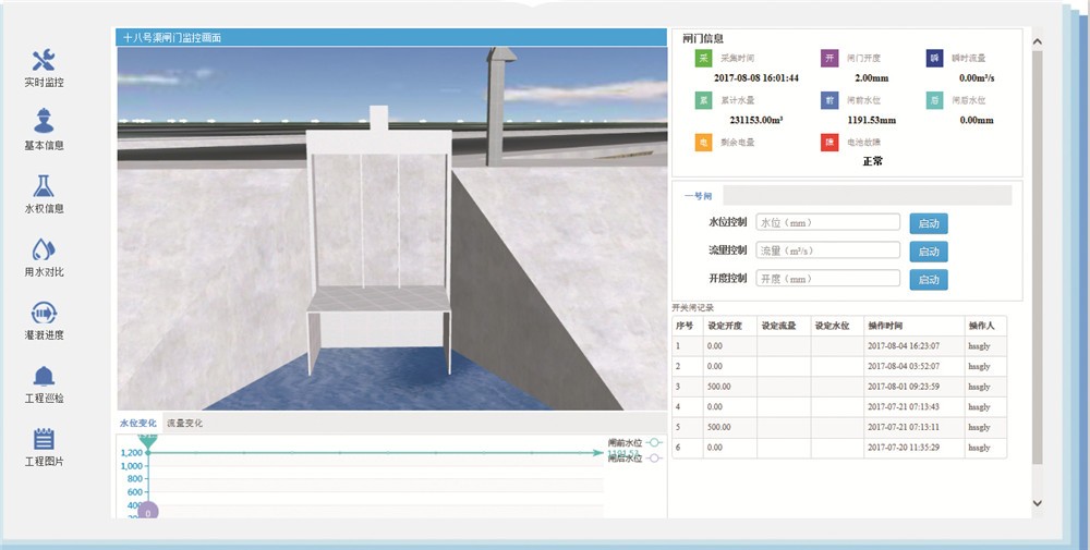 系统基于一工程一档案,一渠一档案以及一协会一档案的逻辑进行建设,基于不同维度查询所有相关信息。如点击闸门节点,可对闸门进行远程实时监控和查阅相关信息,实时监控包括:闸门开度、实时流量、累计水量、水位、远程控制。